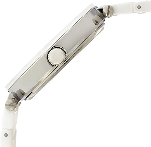 The white dial is enhanced by rose gold-tone hands. Siver-tone metal case, white ceramic and stainless steel strap. Quartz movement. Water resistant to 30 meters/100 feet. Fixed bezel. Scratch resistant mineral crystal. Solid caseback. Jewelry clasp pull/push crown. Case dimensions 33mm x 8mm. Strap 16mm x length. Anne Klein 1019WTWT watch.