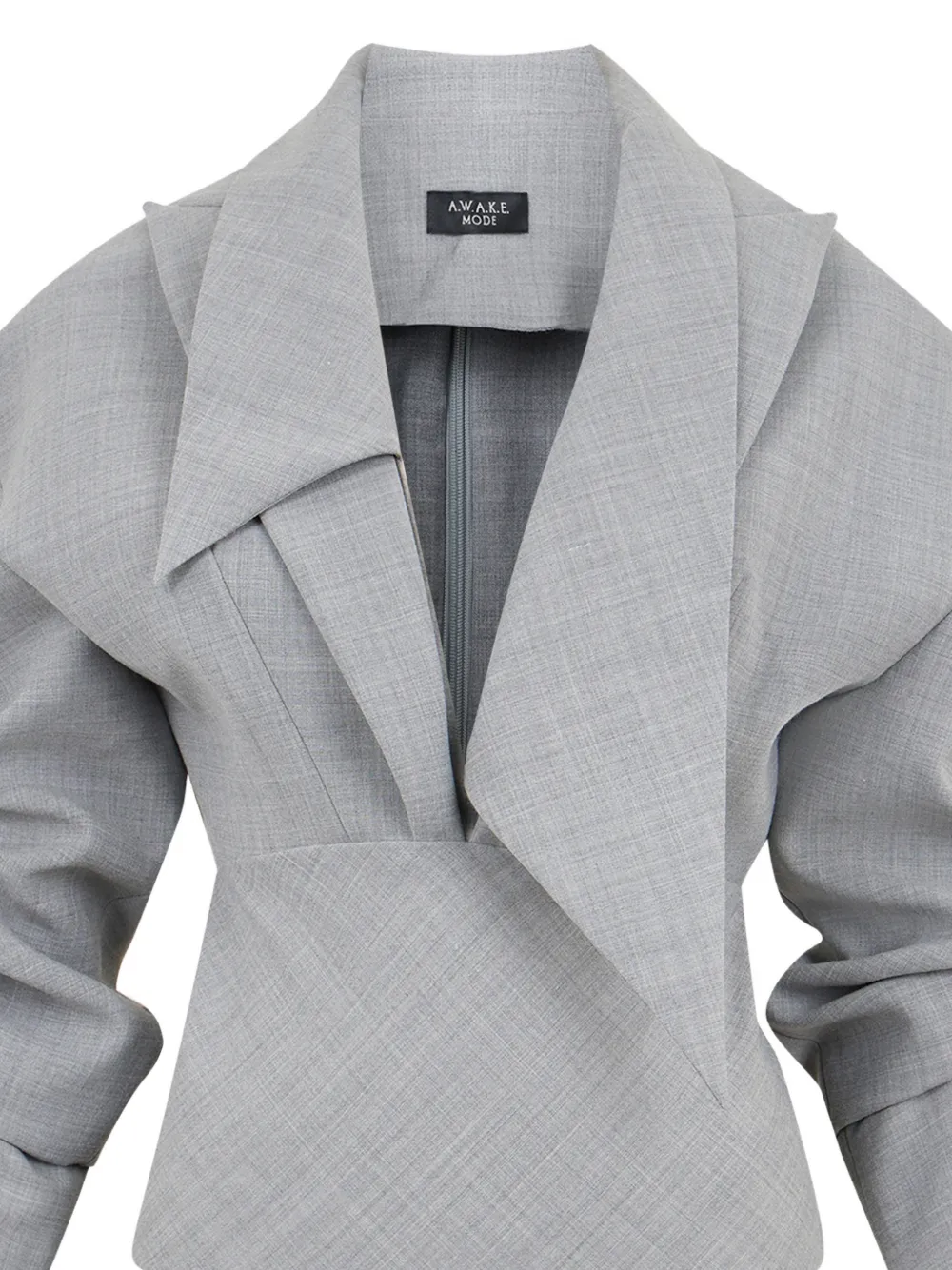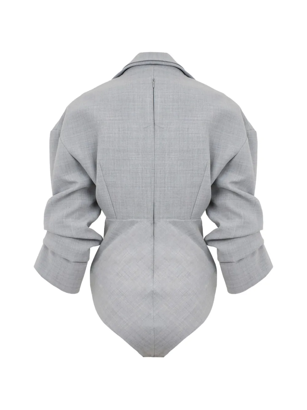 New Season A.W.A.K.E. Mode tailored ruched bodysuit Imported Highlights grey tailored design draped lapels concealed zip fastening at the rear long sleeves ruched sleeves Just a reminder that this piece must be tried on over your own garments. Composition Polyester 75%, Wool 20%, Polyurethane 3%, Elastane 2% Washing instructions Read Manufacturer Guidelines Product IDs FARFETCH ID: 33473841 Brand style ID: PSS26BS01PW01