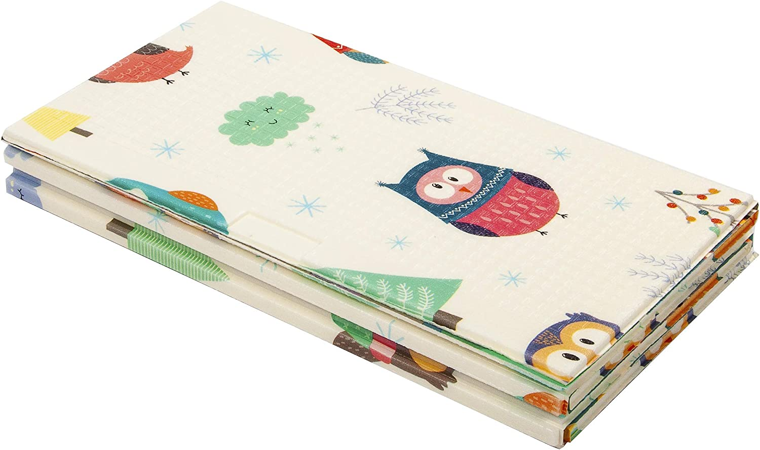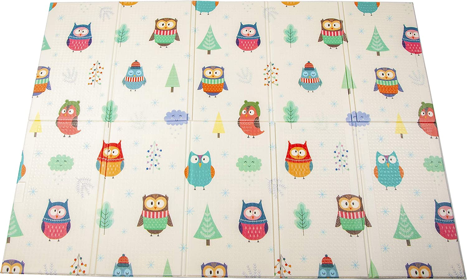 • Double-sided design. Comes with two versions: Animals+Letters and Owls+Cities. Bright color and teaches basic recognition. Full dimensions: 58-inch x 77-inch, 0. 33-inch thick. Folding dimensions: 15. 4-inch x 28. 9-inch, 3. 74-inch thick