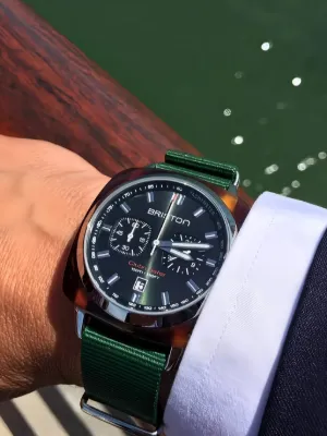 Briston Clubmaster Sport 42mm watch Made in France Highlights green dial round case two sub-dials 60-minute timer set to 9 o'clock 24-hour counter set to 3 a.m. date window push down crown water resistance up to 100m/10 ATM This item comes with a standard two-year warranty from the brand. Composition Acetate, stainless steel, Fabric Product IDs FARFETCH ID: 32754823 Brand style ID: 17142SATS10NBG