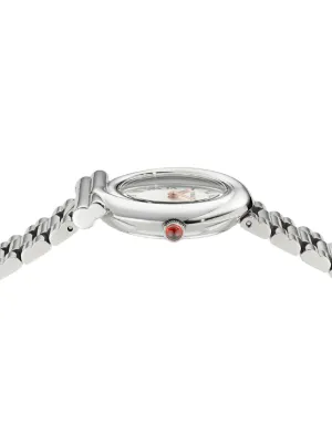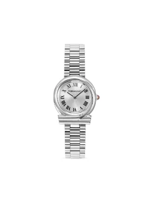 Ferragamo Gancini Twisted 28mm Imported Highlights 28mm silver-tone Roman numeral dial stainless steel folding clasp water resistance up to 50m/5 ATM quartz movement baton hands cabochon crown This item comes with a standard two-year warranty from the brand. Composition Sapphire Crystal, stainless steel Product IDs FARFETCH ID: 24417340 Brand style ID: SFVB00324
