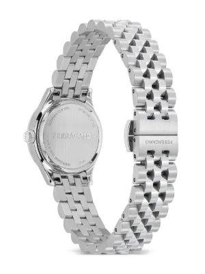 Ferragamo Ragamo Duo 25mm Imported Highlights white 25mm stainless steel round face geometric dial baton hands Gancini plaque quartz movement screw-down crown adjustable link bracelet folding clasp This item comes with a standard one-year warranty from the boutique. Composition stainless steel, Sapphire Crystal Product IDs FARFETCH ID: 26602574 Brand style ID: SFSA00124