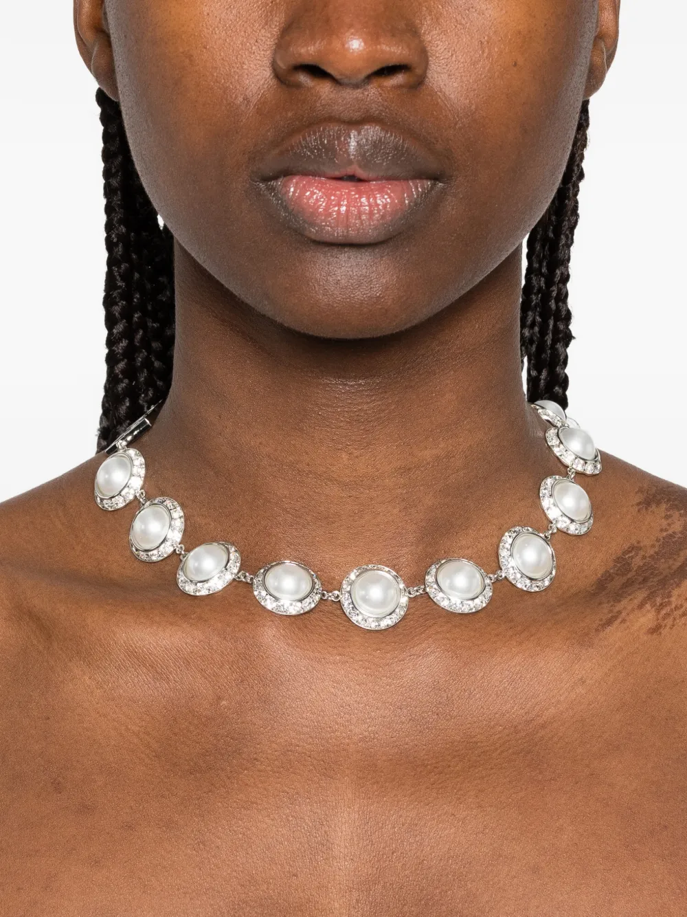 New Season Magda Butrym crystal-embellishment necklace Imported Highlights silver-tone faux-pearl embellishment crystal embellishment chain link lobster clasp fastening adjustable length Composition Brass, Faux Pearl Wearing The model is 5 ft 11 in wearing size OS Product IDs FARFETCH ID: 32437192 Brand style ID: 723426