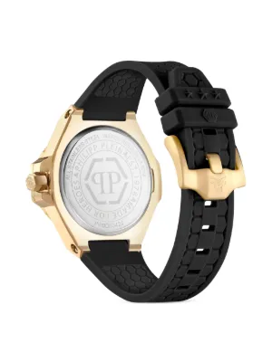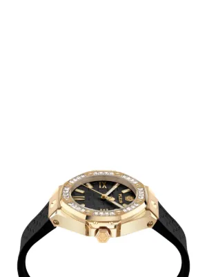 Philipp Plein Lady Royal 39mm Imported Highlights 39mm gold-plated stainless steel crystal embellishment bezel quartz movement Citizen Miyota 1L22 index dial screw-down crown black silicone strap pin-buckle fastening Composition Silicone, glass, Crystal, Yellow Gold Plated Stainless Steel Product IDs FARFETCH ID: 24629468 Brand style ID: PWBDA0424