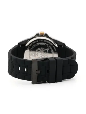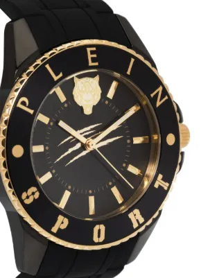 Plein Sport is Philipp Plein's diffusion line that has a sporty and urban aesthetic. For SS24, the brand introduces this Glam 44mm timepiece. The signature Tiger head at the dial is a majestic symbol that celebrates determination and agility, while the four jagged lines known as 'the scratch' claw adorn the black dial in a golden hue.