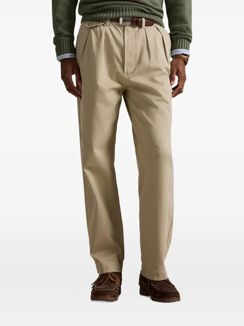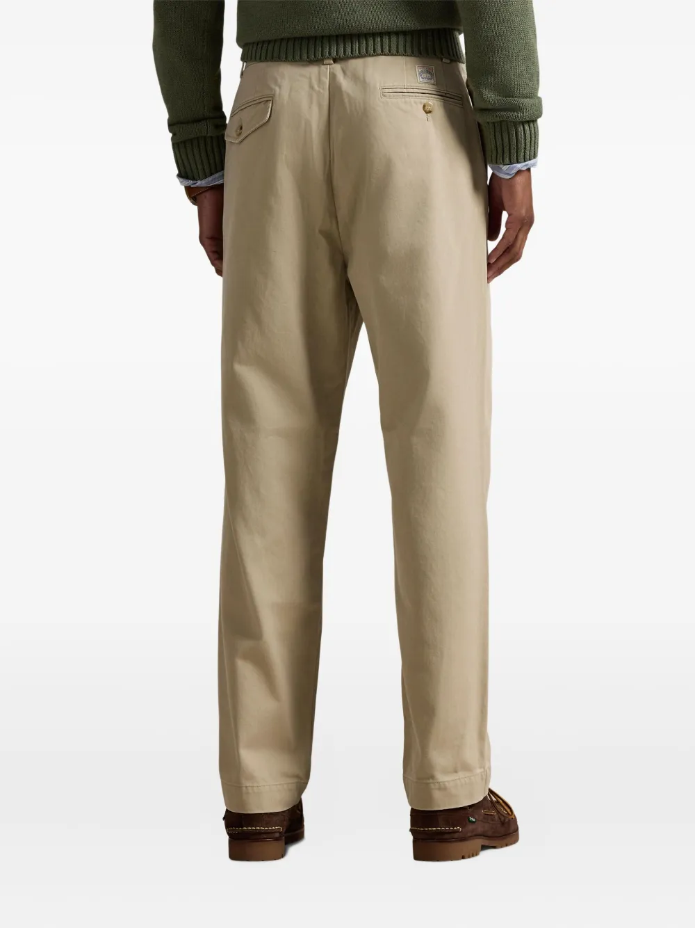 New Season Polo Ralph Lauren pleated twill trousers Imported Highlights washed classic khaki twill texture pleated buttoned back pockets button tab detail belt loops Composition Cotton 100% Washing instructions Read Manufacturer Guidelines Product IDs FARFETCH ID: 32324143 Brand style ID: 710850209018