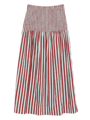 New Season Simon Miller striped maxi skirt Imported Highlights red and blue striped smocked section poplin fabric maxi length Composition Cotton 75%, Nylon 22%, Spandex/Elastane 3% Washing instructions Dry Clean Only Wearing The model is 5 ft 8 in. Product IDs FARFETCH ID: 32016868 Brand style ID: W52303170