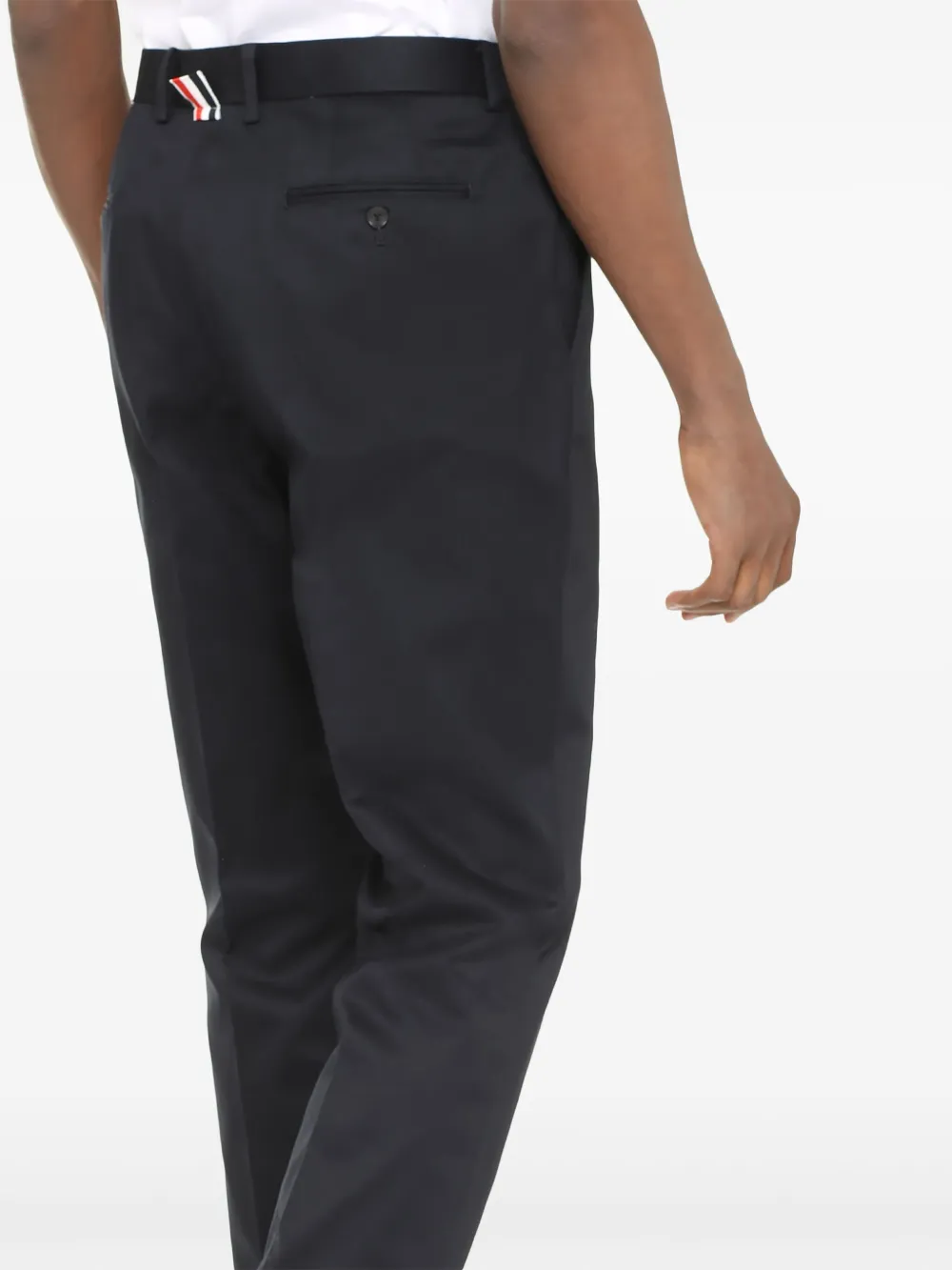 Always favouring clean lines and signature house elements, Thom Browne presents these navy blue chinos. Made from cotton, this slightly cropped pair is detailed with the label's recognisable grosgrain loop tab to the rear and a logo patch to the side.