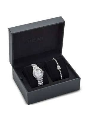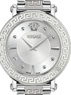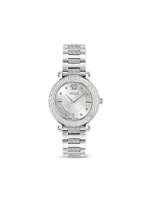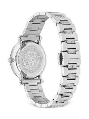 Final Sale Versace Greca Sphere 35mm Imported Highlights 35mm stainless steel round face signature Greca detailing index dial baton hands screw-down crown stainless steel link bracelet folding clasp quartz movement Composition stainless steel, Sapphire Crystal Product IDs FARFETCH ID: 24417390 Brand style ID: VE9C00324