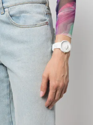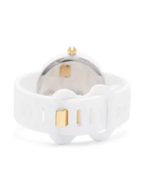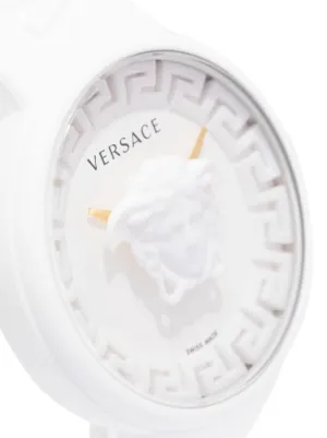 Versace Medusa Pop 39mm A modern take on a classic timepiece, this fun silicone watch boasts some of Versace's most iconic motifs, with the Medusa and La Greca symbols taking centre stage at the dial. Gold-tone accents lend the Swiss quartz watch a refined touch. Imported Highlights white round face Medusa Head motif signature La Greca print index hands rubber strap quartz movement gold-tone hardware water resistance up to 30m/3 ATM This item comes with a standard two-year warranty from the brand. Composition Rubber, Metal, glass Wearing The model is 5 ft 10 in wearing size OS Product IDs FARFETCH ID: 20246380 Brand style ID: VE6G00123