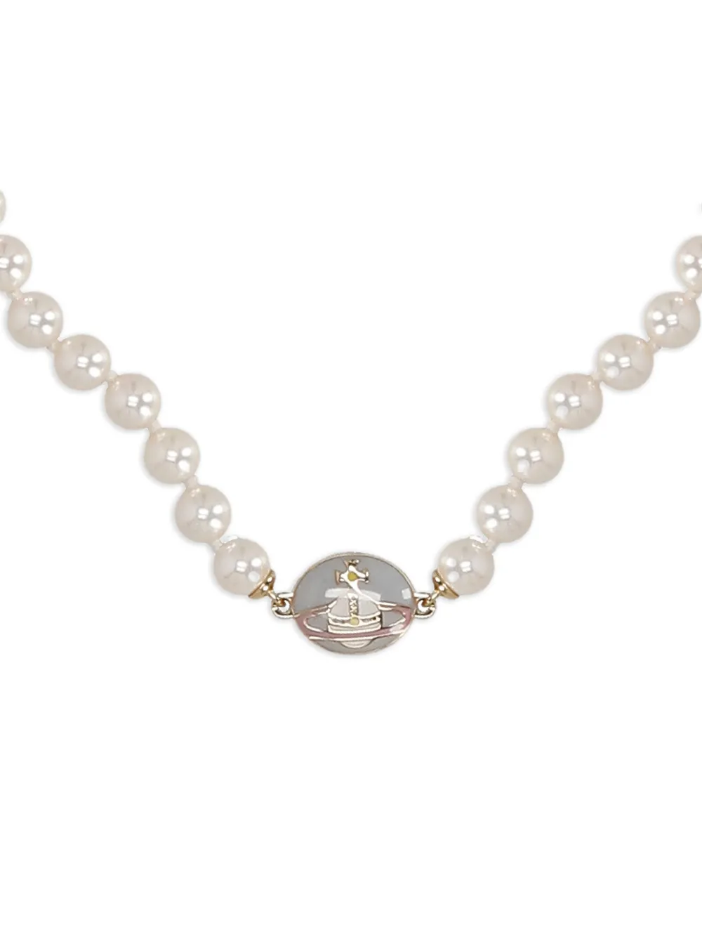 Vivienne Westwood orb pearl necklace Imported Highlights white hand-painted logo magnetic button orb detail gold-tone hardware Composition Gold Plated Brass, Faux Pearl Product IDs FARFETCH ID: 32628080 Brand style ID: 6303002002R919R919